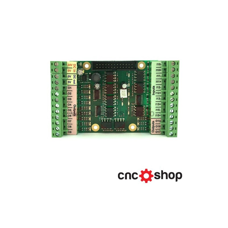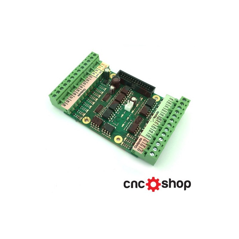 Interfata CNC 12 iesiri 5 intrari, optocuploare de viteza, alimentare 24V, MOSFET, indicare stare cu LED-uri, mufe cu terminal. Conectare DB25, UC100, UC300, UC400, AXBB. Soft UCCNC sau MACH3
