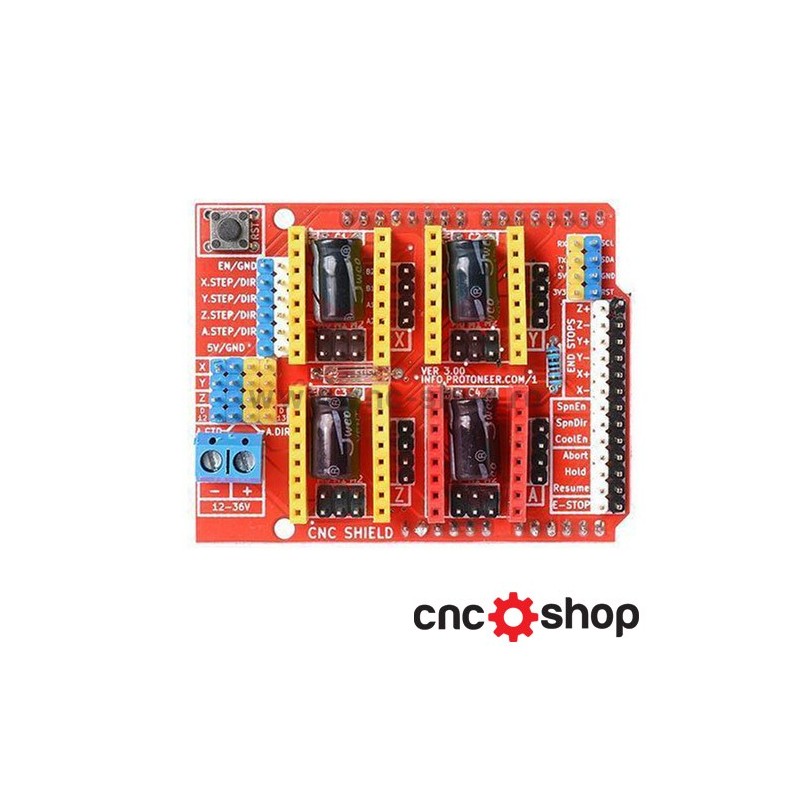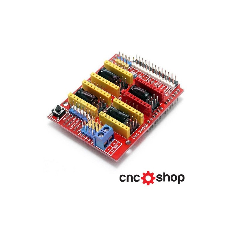 Modul shield pt. Arduino, poate controla cu software-ul GRBL un CNC, 3D printer, laser, plotter, cutter, gravator, etc. Comanda 4 axe driver A4988 (XYZ si A slave), 2A max. alimentare separata motoare pana la 35V, jumpere micropasire.