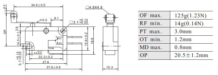 Un limitator robust, Made in Japan, pt. aplicatii industriale, parghie de aclansare cu rola (parghia -25 mm, rola diametru 4,5 mm/5 mm), dimensiuni corp (28 x 16 x 10mm), conectori plati pt. mufe papuc, 15A/250V, contacte NC, NO, COM.