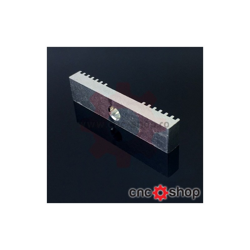 Piesa de fixare capat curea GT2 din aluminiu prelucrat CNC, cu pas 2mm, gaura centrala de fixare, doua capete. Asigura o prindere ferma a curelei deschise pe caruciorul mobil.